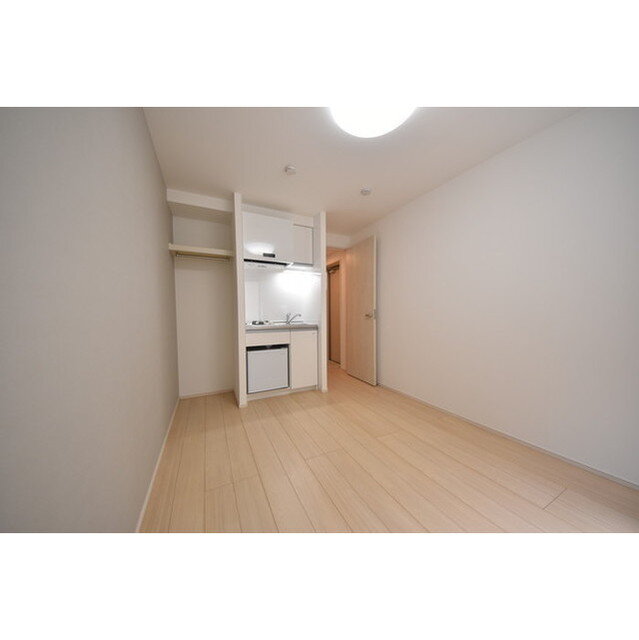 室内はワンルームタイプで、1口ガスキッチン(ミニ冷蔵庫付き)や浴室乾燥機・温水洗浄便座など便利な設備を完備。エアコン・室内物干し・シューズボックスもあり、快適な暮らしをサポートします。