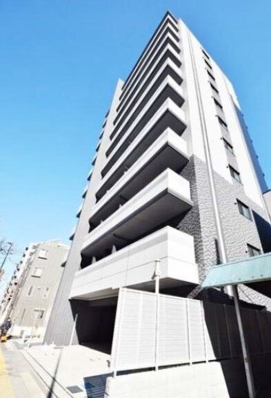 荒川区東尾久1丁目、尾久橋通り沿いに建つ「イアース西日暮里」。2017年9月築、地上11階建て・総戸数40戸、ホワイトとブラックを基調としたツートンカラーのスタイリッシュな外観の高級分譲賃貸マンションです。